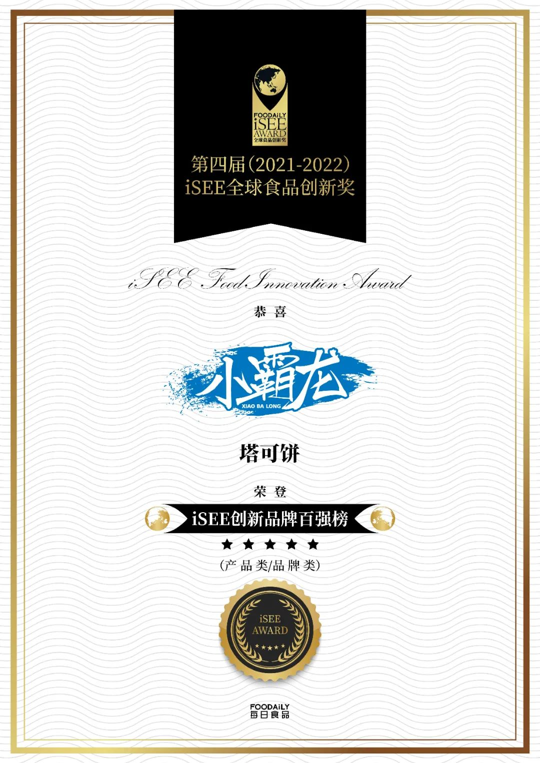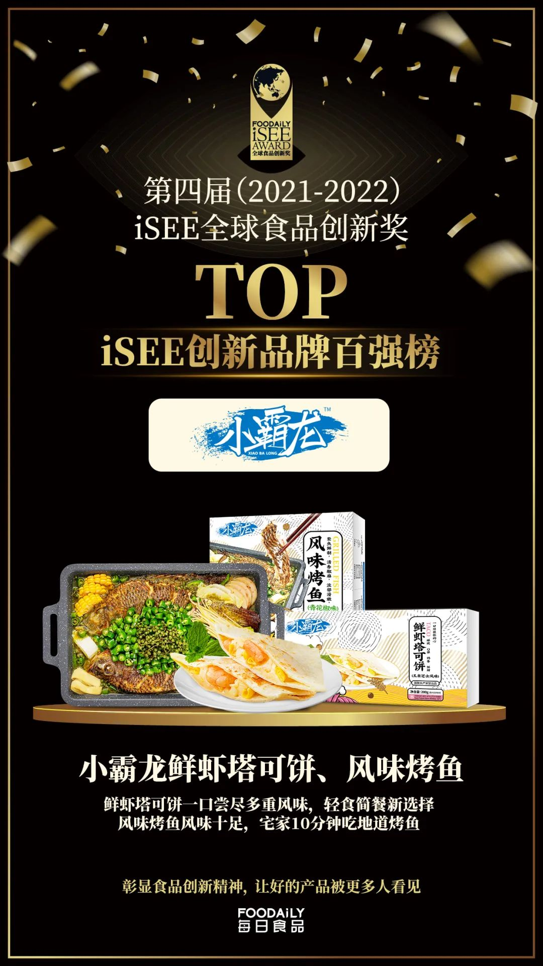 2022年3月24日,由“Foodaily每日食品”發(fā)起的第四屆(2021-2022)iSEE全球食品創(chuàng)新獎(以下簡稱iSEE創(chuàng)新獎),隆重公布產(chǎn)品類&品牌類【iSEE創(chuàng)新品牌百強榜】。國聯(lián)水產(chǎn)集團旗下預(yù)制菜品牌“小霸龍”,憑借風(fēng)味烤魚、鮮蝦塔可餅殺出重圍,光榮上榜。