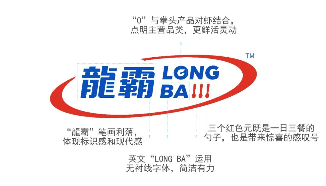 沿用的中文繁體字“龍霸”傳承了舊LOGO的核心,保留經典元素,而并非顛覆原有標識。字體從藝術毛筆字更新為筆畫利落的現代感字體,英文字“LONG BA”更顯品牌獨立性,簡潔有力,彰顯國際范。英文字母“O”融合了龍霸的拳頭產品“對蝦”的元素,點明龍霸品牌主營品類的同時,賦予標識更鮮活靈動的點綴。